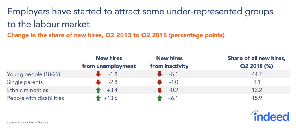 Employers struggling to find recruits might consider looking for new hires in new places. Searching broadly across demographic groups can offset pressures from the fall in the number of European workers in the UK. While employers have increased hiring from some underutilised domestic groups, unemployment rates for all those groups are still high. These represent areas of hiring opportunity.