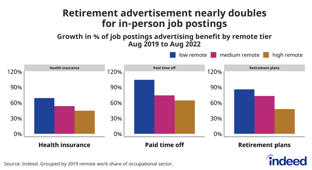 - Indeed postings in low-wage sectors that are more likely to be in person have seen the fastest growth in advertisement of health insurance, paid time off, and retirement plans over the past three years.