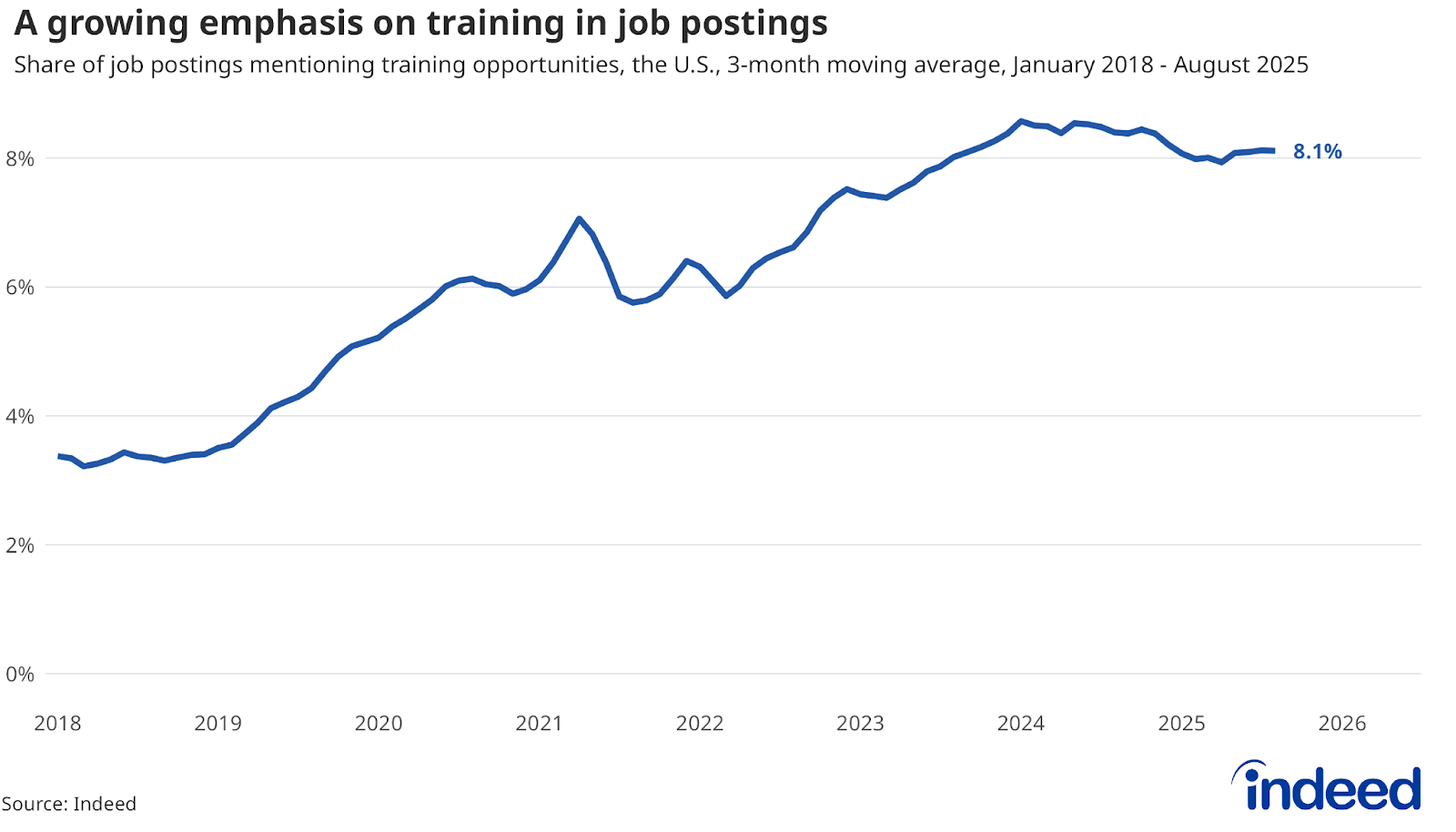 - The share of US job postings mentioning training programs rose from 3.4% in January 2018 to 8.1% in August 2025.