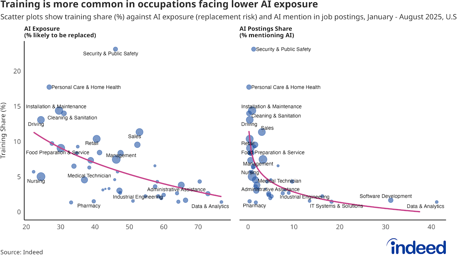Another dimension is how training intersects with AI. Earlier Hiring Lab research and the Indeed AI Tracker measure AI exposure (the likelihood that tasks could be affected by AI) and AI adoption (the share of job postings mentioning AI), respectively. Linking these measures shows that both AI-exposure and AI-adoption are negatively correlated with training — training opportunities decline the more exposed a role is to AI transformation and/or the higher the adoption rate of AI is in a given industry.