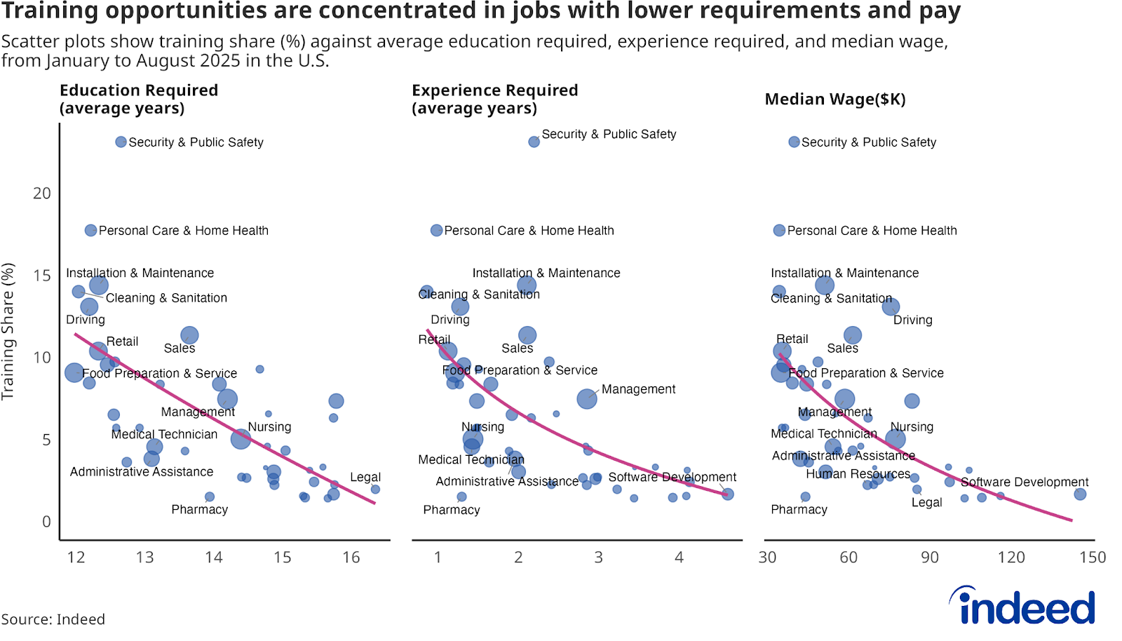 In 2025, security & public safety and personal care & home health topped the list of occupations with the highest shares of postings offering some form of on-the-job training, with more than one in five postings in these occupations explicitly mentioning training opportunities. An example of a job posting in the security field included this description: “What We Offer: Competitive salary. Comprehensive paid training program. Great company culture.” A posting for a personal care role noted, “No experience is required to start because we offer free training to earn your home health aide certificate.”