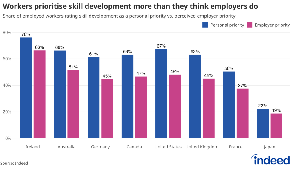 Data from Indeed’s Workforce Insights Survey, conducted across eight countries, show that this is not just a theoretical concern. Workers consistently prioritize skill development, but many believe that their employers do not share that sense of priority. Access to employer-provided training is also highly unequal, with workers without a university degree less likely to receive it.