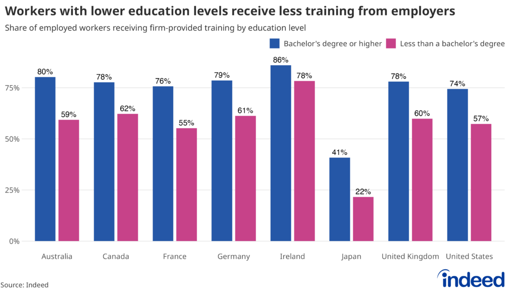 In Ireland, the country with the most training, 86% of bachelor’s degree holders reported receiving some form of firm-provided training, compared to only 78% of those without a degree, a gap of 8 percentage points. In other countries, the education gap in training is much larger: 21 percentage points in Australia and France, 19 points in Japan, 18 points in Germany and the UK, 17 points in the US, and 16 points in Canada.
