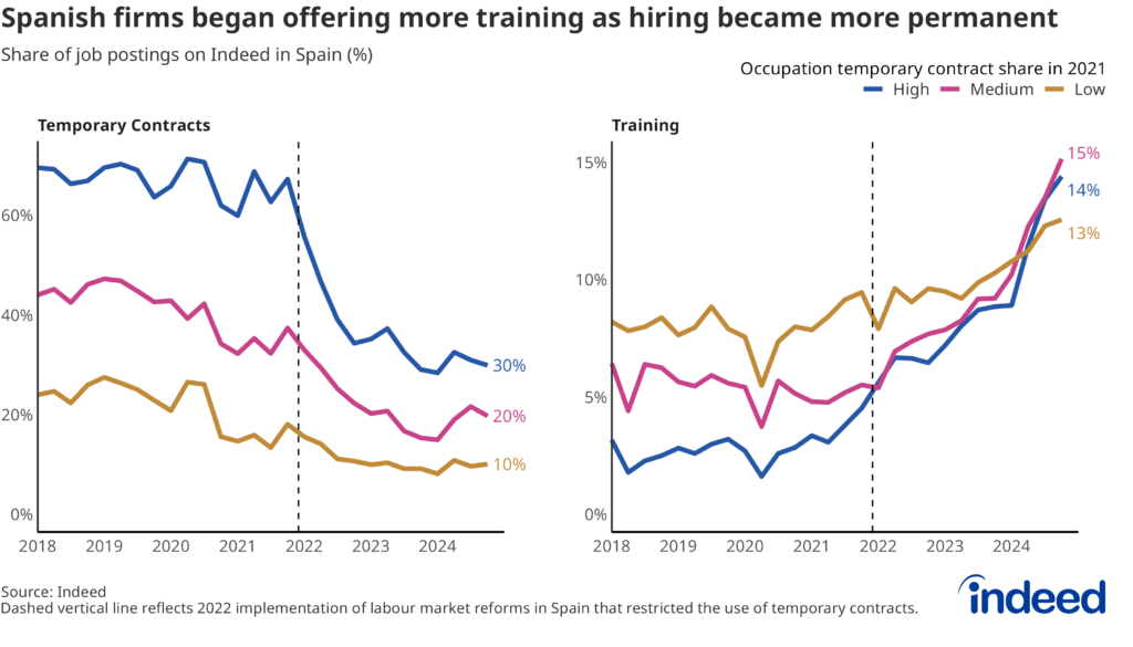 A new working paper, published jointly by economists from the Hiring Lab, WZB Berlin Social Science Center, and Universidad Complutense de Madrid, shows that policy can make a difference. The data show that Spain’s 2022 labor market reform, which sharply restricted temporary contracts, led to an increase in permanent contracts and firm-provided training in the occupations most affected by the reform.