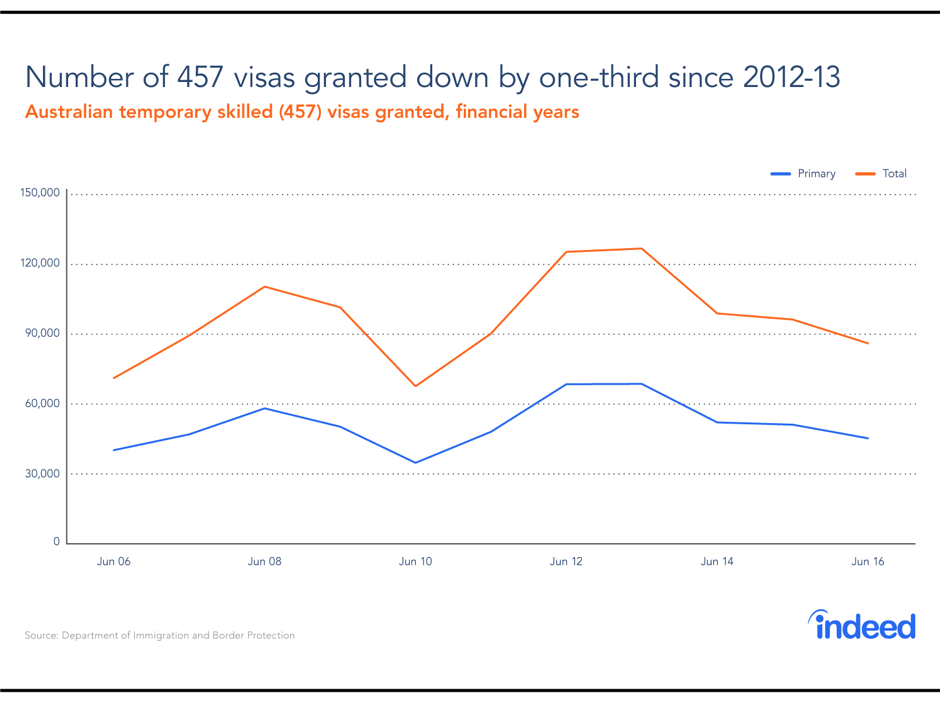 - The number of 457 visas granted has fallen a third from its peak in the 2012–13 financial year.