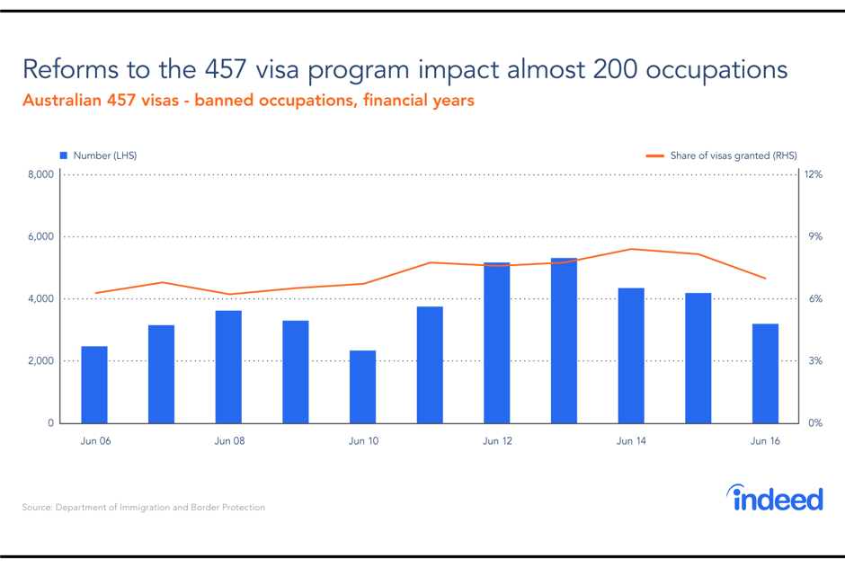 As part of the 457 programme reform package, the federal government banned almost 200 occupations from the visa application process. (Initially, 216 occupations were banned but the number was reduced on July 1.) The banned occupations have accounted for 7–9% of visas during the past five years. The list of eligible occupations will be revised on an ongoing basis every six months to respond to skill shortages that develop.