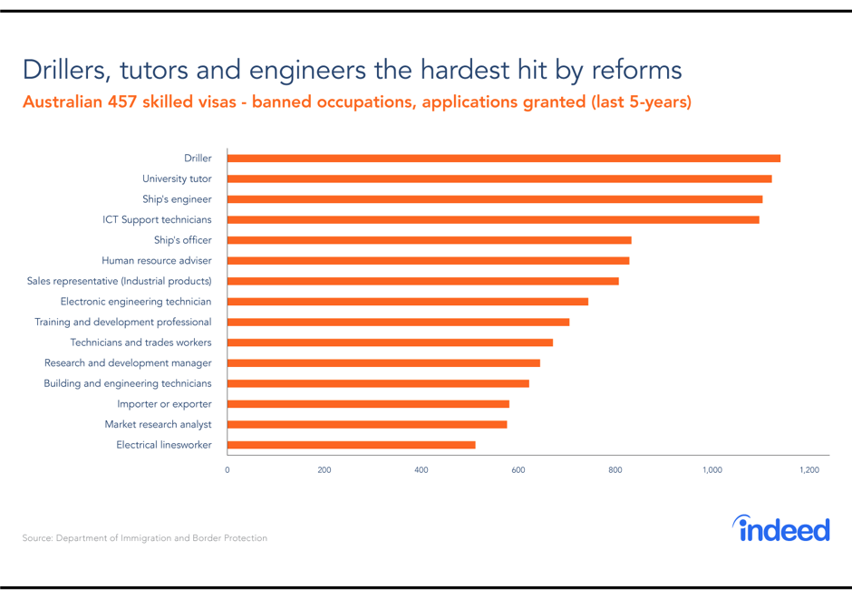 Nevertheless, indirect effects have the potential to create economically harmful uncertainty. In particular, the age limits, the higher standards for English language competency and greater barriers to permanent residency may deter outstanding foreign workers, as evidenced by the finding that Indeed Australian job postings registered 10% fewer clicks by job seekers outside the country in June than in April.