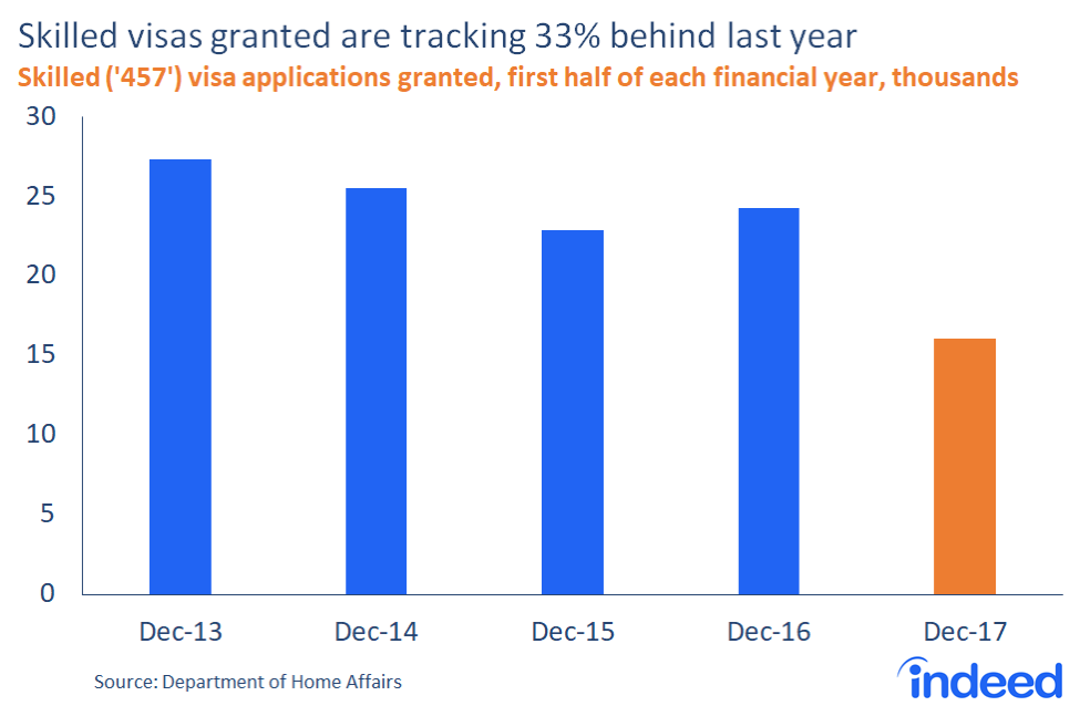 - Between July and December 2017, the number of temporary skilled 457 visas granted declined by one-third compared with the same period a year earlier.
