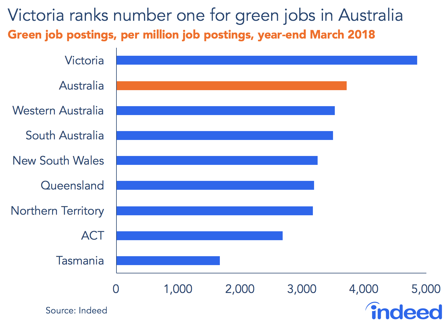 Western Australia’s green jobs decline comes as a surprise given the ramp-up in iron ore and coal production over the past three years. An Indeed analysis of the United States found a greater concentration of green jobs in areas with high concentrations of ‘dirty’ jobs. This doesn’t appear to be the case in Australia. Western Australia and Queensland, the two states with a high concentration of mining jobs, rank slightly below the national average for green opportunities.