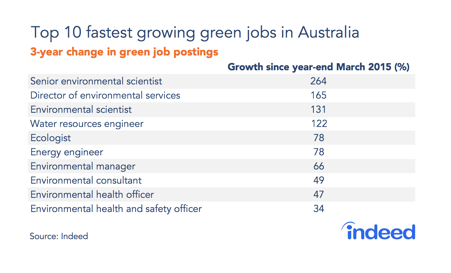 However, some green jobs have seen better days. Over the past three years, job postings in two of Australia’s top 10 green jobs–water treatment specialist and safety, health and environmental assistant–fell one-quarter and one-third respectively. Meanwhile, year round sunshine wasn’t enough to keep opportunities for solar installers from falling 4.6%.