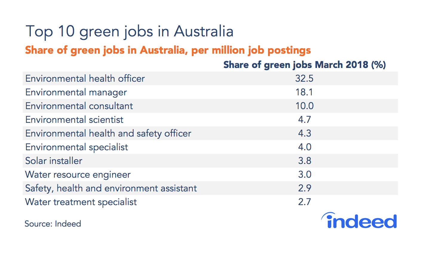 Environmental health officer ranks as Australia’s top green job, accounting for almost one-third of total green jobs. It ranks ahead of environmental manager at 18% and environmental consultant at 10%. There are also opportunities for workers with varying levels of education and experience–officers and assistants at the junior end, and managers and specialists for those with greater experience.
