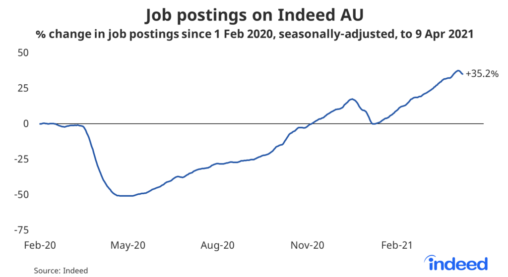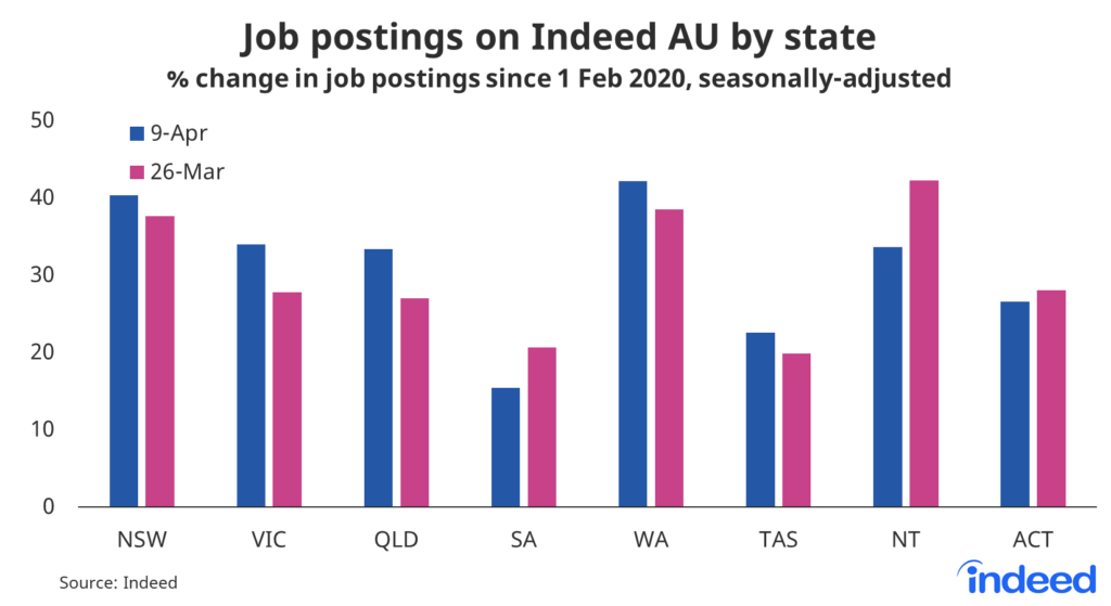 Postings have softened over the past week. This could reflect some residual seasonality from Easter, which is typically a slow period for hiring. It also coincides with the end of the JobKeeper wage subsidy on March 28.