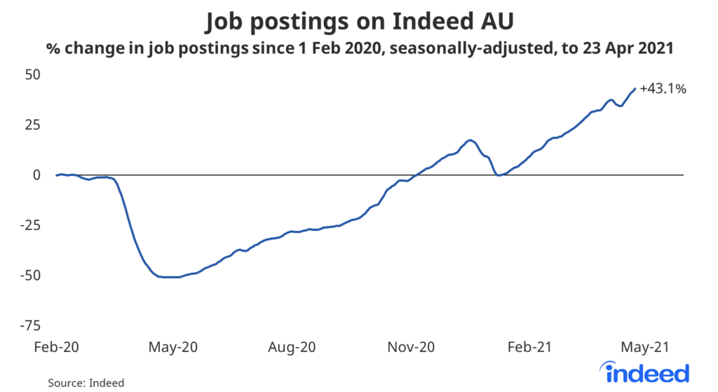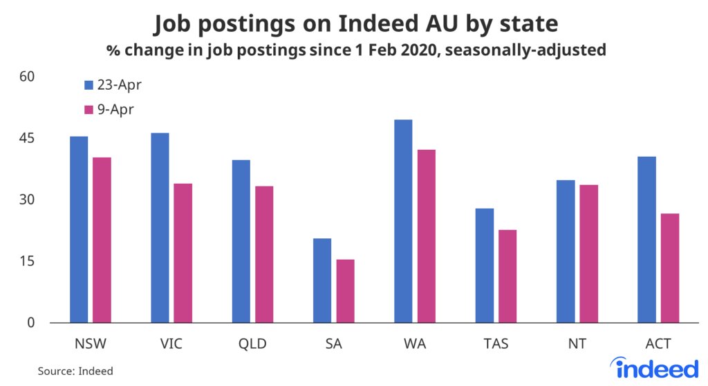 Compared with last year’s baseline, postings are up 49.5% in Western Australia, 46.2% in Victoria and 45.5% in New South Wales. South Australia and Tasmania bring up the rear but are still up 20.6% and 27.9%, respectively.