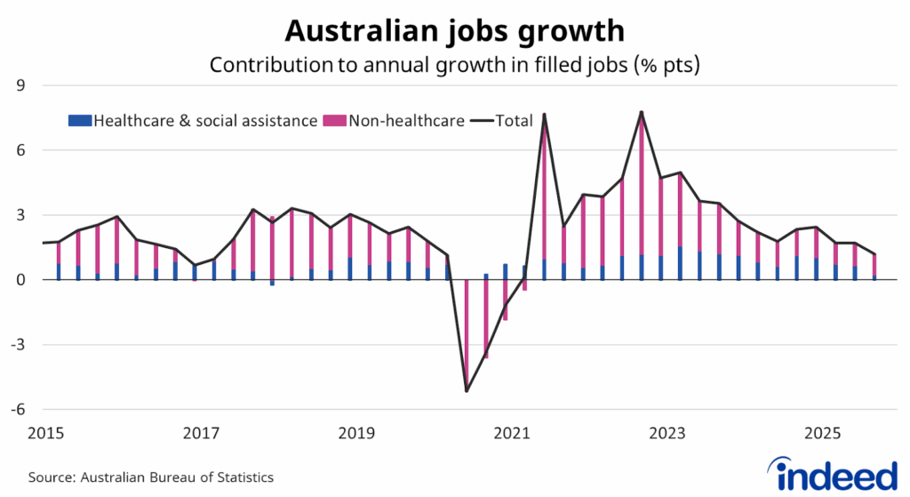 Australia’s job market is by no means weak – many key measures remain strong by historical standards – but it clearly entered a different phase last year. Whether that continues in 2026 will depend heavily on one industry: healthcare & social assistance.