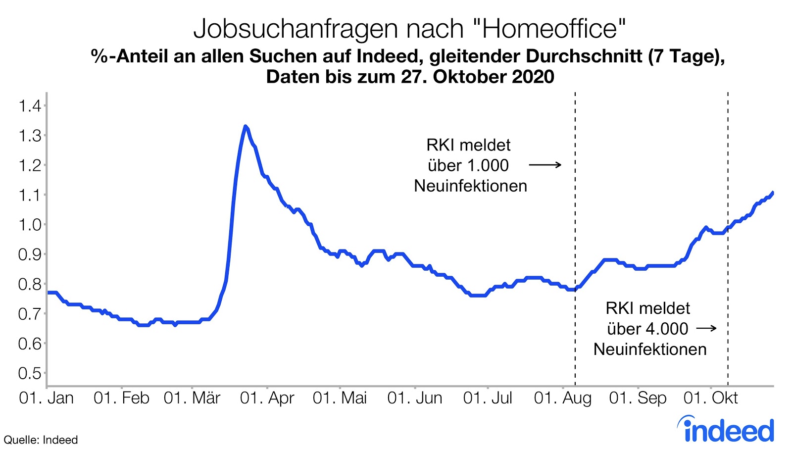 Kaum gehen jedoch die Covid-19-Fallzahlen im Sommer nach oben, steigt auch wieder das Interesse von Jobsuchenden an Homeoffice-Jobs. Seit Anfang August bis Ende Oktober hat der Anteil der Suchanfragen um 42 Prozent zugenommen und liegt mit 1,1 Prozent aller Suchanfragen nicht mehr weit entfernt vom Höchstwert Ende März. Daraus lässt sich schlussfolgern, dass die zweite Homeoffice-Welle begonnen hat.