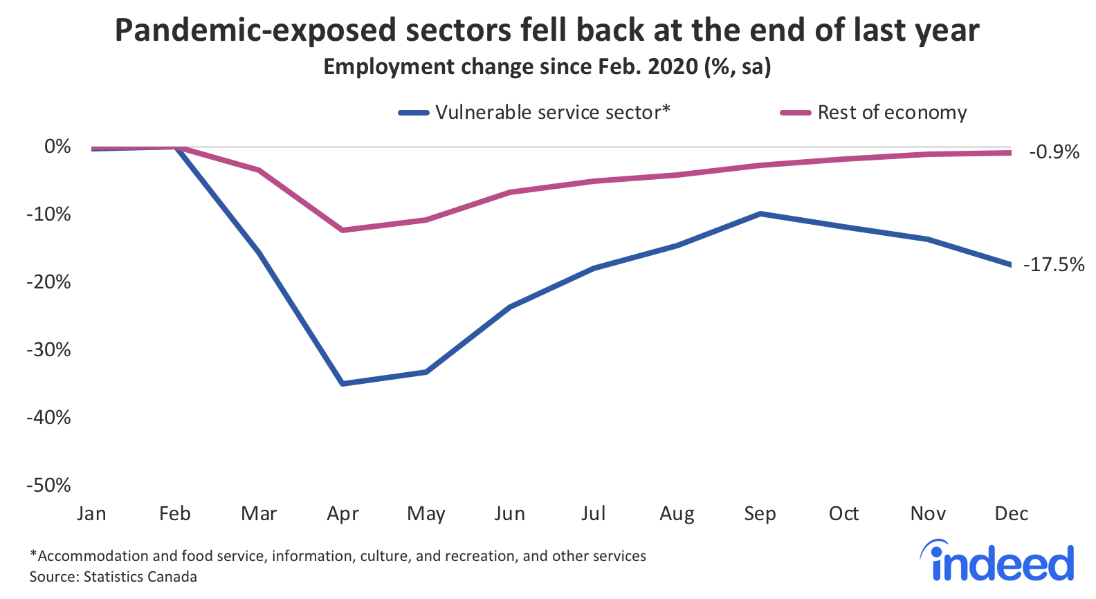 The second wave of the pandemic made a clear imprint on the Canadian labour market as 2020 came to a close. Vulnerable parts of the service sector, namely accommodation and food services, as well as arts and recreation, started to slide in October, and in December were joined by “other services,” which include areas of personal care, like hair salons. At the same time, the setback to overall employment wasn’t too severe, in part because sectors not as directly exposed to the pandemic continued to add jobs.