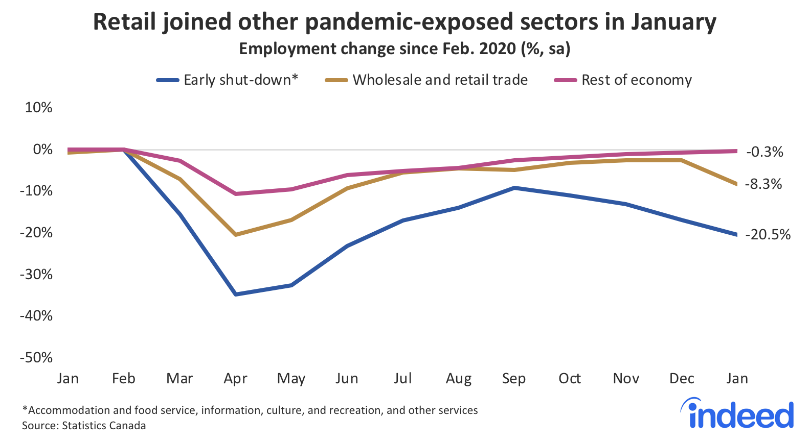 Today’s job numbers once again highlighted the balancing act between the most pandemic-exposed sectors and the rest of the economy, a similar story to the end of last year. Retail trade joined the list of areas impacted by public health restrictions, tipping the scales further in January. Conditions in less affected industries were mixed, but overall edged upward.