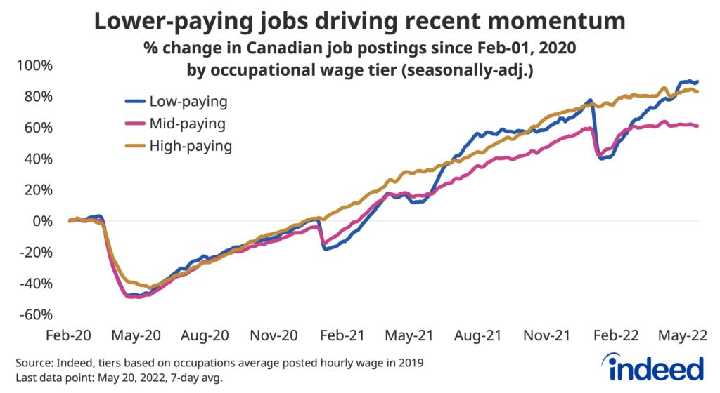 - Total Canadian job postings on Indeed were up 72% on May 20, 2022 compared to their pre-pandemic level, up marginally from a month earlier.