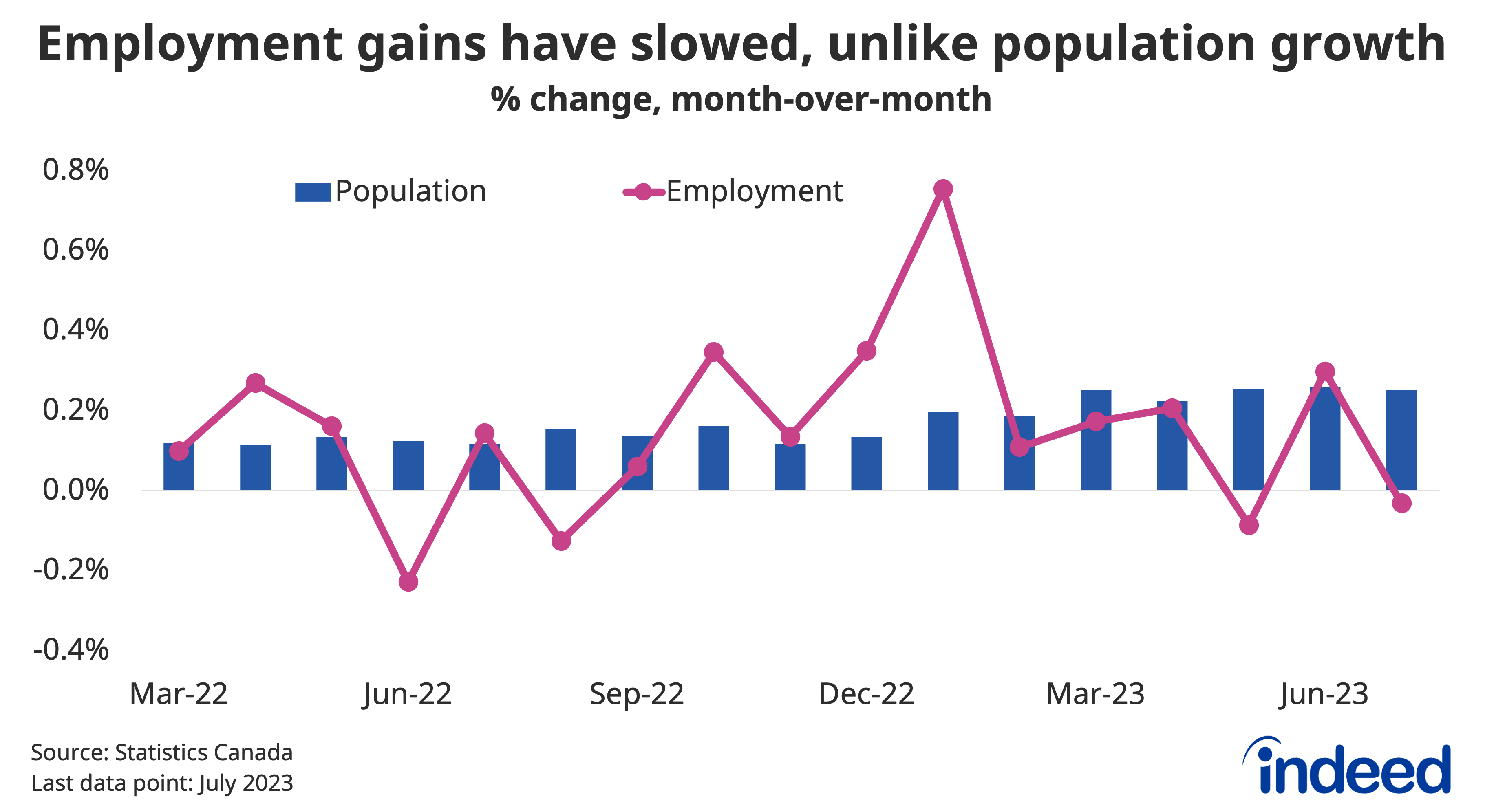 Canadian employment was flat in July, following a downshift in momentum that began in the second quarter. Slight monthly declines aren’t rare in the LFS, but they do stand out when the population is growing so quickly. Hours worked edged out a small gain, but have also been relatively flat in recent months. Overall, the employment rate – the share of the population with a job – has slipped, but remains in solid shape. But StatCan noted that the share of recent newcomers to Canada who were working had slipped over the past year, partially reversing substantial increases earlier in the recovery.