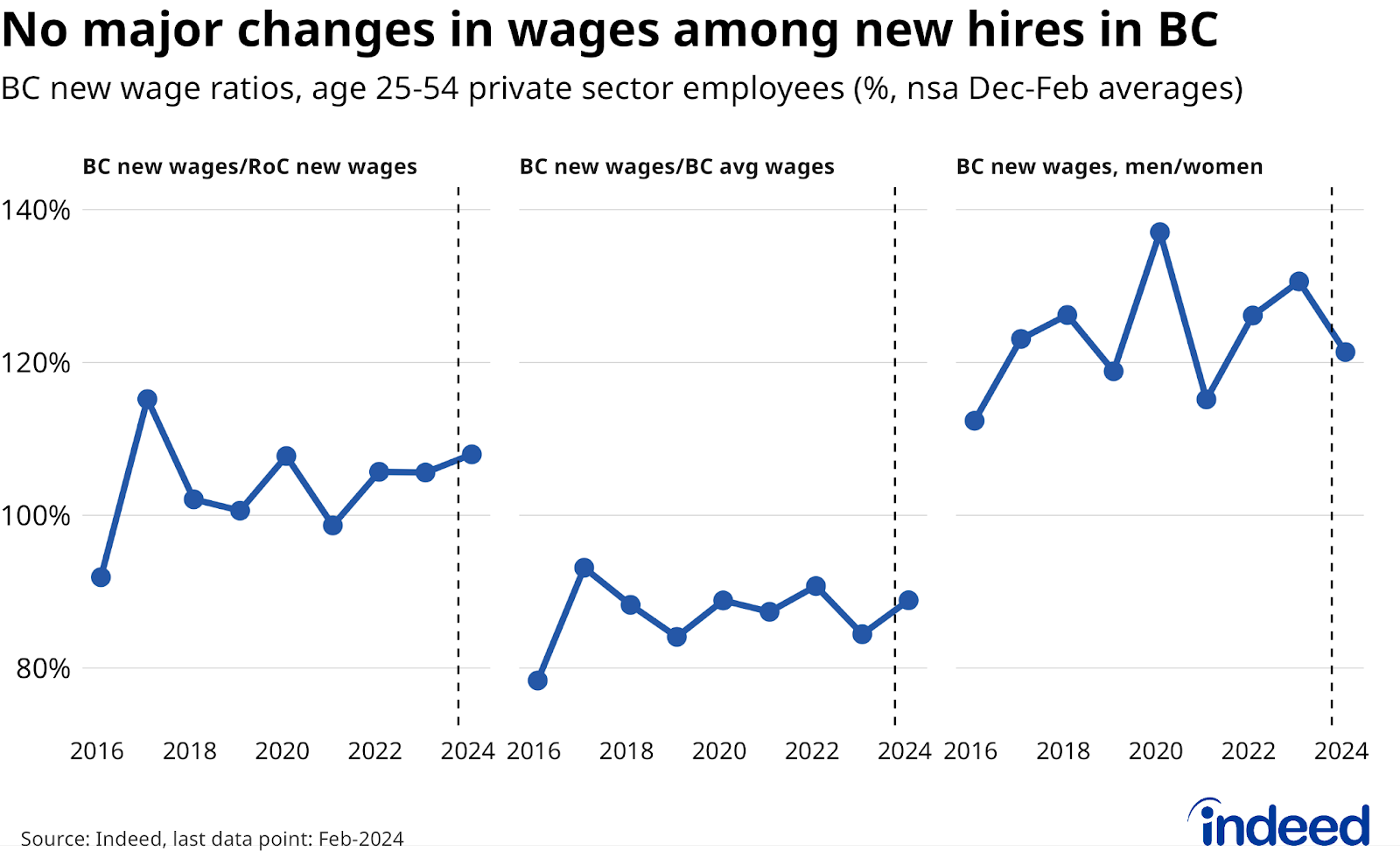 Another potential impact could be on recruitment activity more broadly. Some employers might hold off on posting a new job ad if they expect to pay higher wages, since candidates now have greater information about wage levels across the market. However, at least at the province-wide level, BC job postings haven’t lagged the rest of Canada in recent months. Instead, BC’s share of total Canadian job postings on Indeed ticked up between October 2023 and February 2024, standing slightly higher than it did a year earlier.