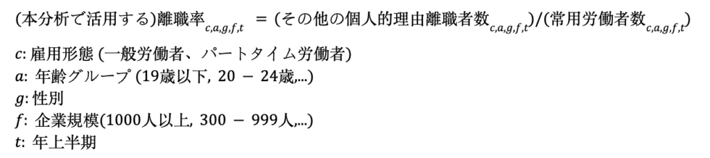 また「雇用動向調査」では年次データ(利用可能期間:2012年-2022年)と年上半期データ(利用可能期間: 2020年1-6月期 ~ 2023年1-6月期)が公開されているものの、離職率の分母である「常用労働者数」は、年計データの掲載場所においても、上半期期間の数値のみ公開されている。よって離職率は「その他の個人的理由離職者数」を「常用労働者数」で割って算出することから、必然的に年次平均ではなく年上半期平均ベースで算出されることとなる。