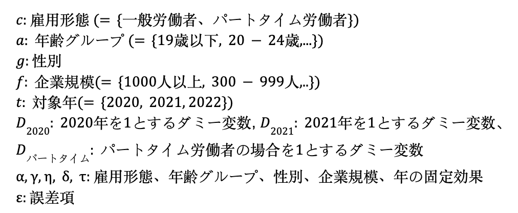 年と雇用形態に対して交差項を作成している。この理由は、1-6月期と1-12月期の関係について、パンデミックの深刻な時期とそれ以外で離職への感応が異なると考えられることと、パンデミックの深刻な時期とそれ以外で雇用形態における離職への感応も変化すると考えられるためである。実際に一般労働者において2020年1-6月は2020年1-12月全体に比して高い離職率となる傾向があり、通常の時期における関係性から逸脱していることが、下図表及び推定結果から確認される。尚、他の固定効果との交差項も追加した推定も行った結果が実質的に大きく変化しないことが確認されたため、年と雇用形態に対して交差項を入れた推定式を本分析では用いることとした。