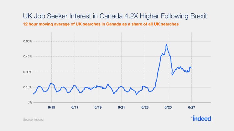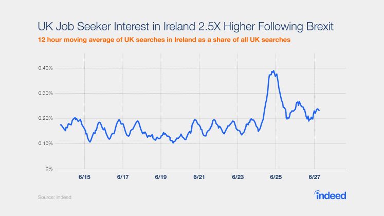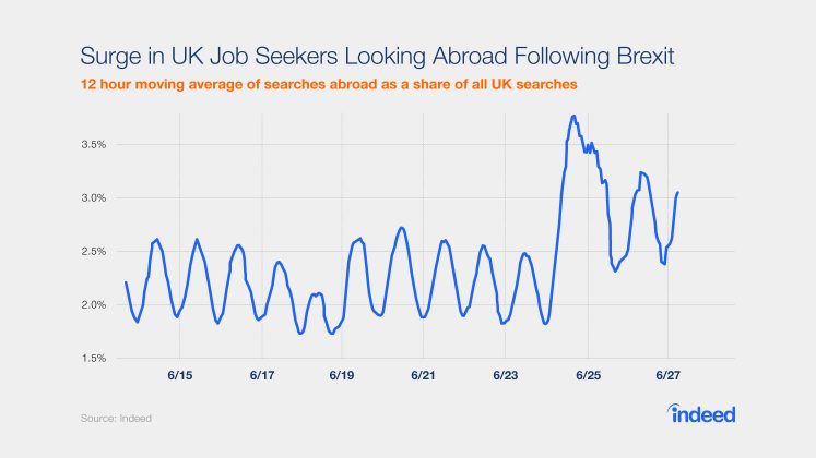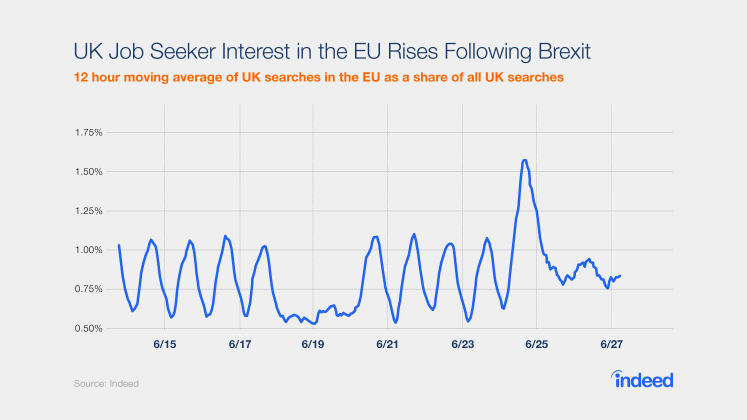 When the Greek government held a referendum on the terms of its bailout agreement in 2015, Indeed saw a spike in Greek job seekers searching for work elsewhere in the EU. In the aftermath of the Brexit vote, we saw a similar pattern.