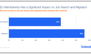 Of course, cross-border job search does not equal migration. However, when we ran the same model in order to explain the direction of migration flows, as measured by the Organization for Economic Cooperation and Development (OECD) we found that all the relevant effects remain consistent. This time, however, EU membership is associated, on average, with a 56% additional increase in migration flows exchanged among member countries.