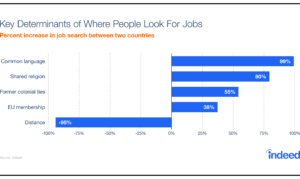 As the chart above makes clear, our analysis shows that language is the most significant determinant of the amount of job search exchanged between two countries: those that share a common tongue exchange 99% more searches, controlling for the other determinants.