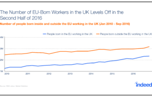 Hiring Lab research published in March found that the UK is the top destination for job seekers in the EU. In fact, we saw that Britain receives about three times as much interest from jobseekers based in other EU countries as either of the next two most popular destinations—Germany and France. Even in the months following the Brexit vote, the UK remained a popular destination for job seekers across Europe. Job search patterns on Indeed reflect the official migration statistics: the latest ONS data covering the three months following the Brexit vote show that net migration remains around record levels. The inflow of EU citizens is also at historically high levels and there has been a significant increase in people looking for work, particularly from the EU.