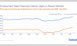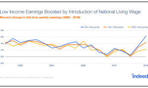 Uncertainty brought about by the Brexit referendum contributed to a dampening of hiring sentiment in the labour market. Even before the referendum, Indeed Industry Employment Trends, a monthly index of UK job postings, showed declines starting in February 2016, signaling a deterioration in British employers’ willingness to hire that is only just now beginning to materialize in official employment figures.