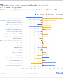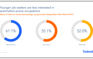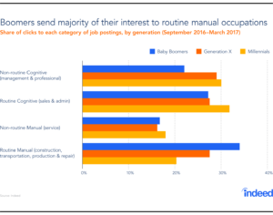 This analysis is based on six months of Indeed job seeker activity, from September 2016 to March 2017. Job seeker interest is measured as the volume of clicks to job postings in each occupation group as a share of clicks to all job postings. Indeed job postings are organized into their relevant US Bureau of Labor Statistics’ Standard Occupational Classification (SOC) category. The SOCs are then grouped in the following categories based on their primary job functions: non-routine cognitive, non-routine manual, routine cognitive, and routine manual, as has been done in previous research. Job seeker age is estimated based on resume characteristics and categorized into the relevant generation, using Pew Research Center definitions: millennials (ages 20-36 in 2017), Generation Xers (ages 37-52 in 2017) and baby boomers (ages 53-71 in 2017).