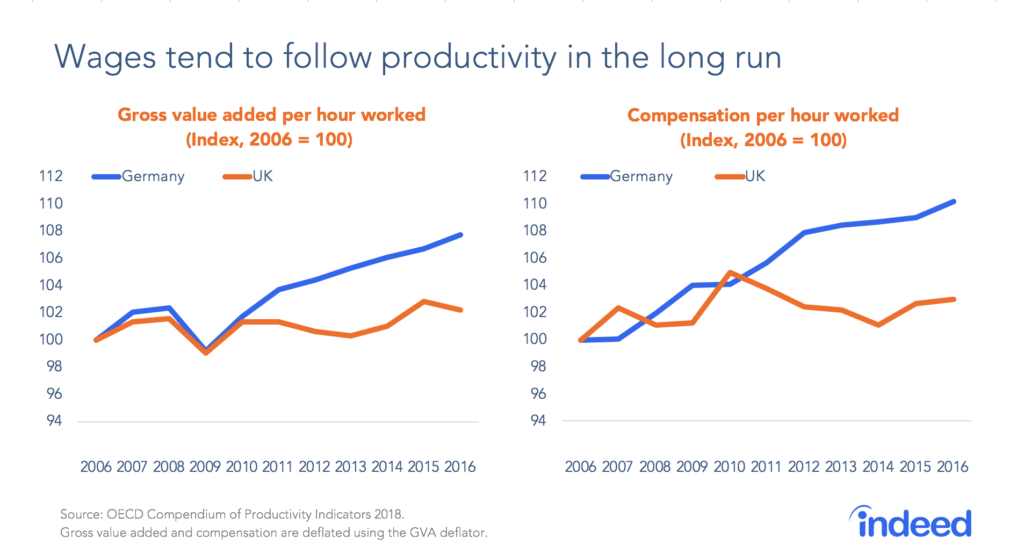 Wage growth. In real terms, we are unlikely to see sustained, rapid growth in pay until we see faster productivity gains. That is because rising productivity is one of the most important determinants of wage growth in the long run. The charts comparing the post-crisis experience of the UK with that of Germany illustrate this relationship. In Germany, the pace of productivity improvement recovered after the crisis, but not in the UK, with pay following productivity’s lead in both countries. Developments on the productivity front are something to monitor closely in 2019.