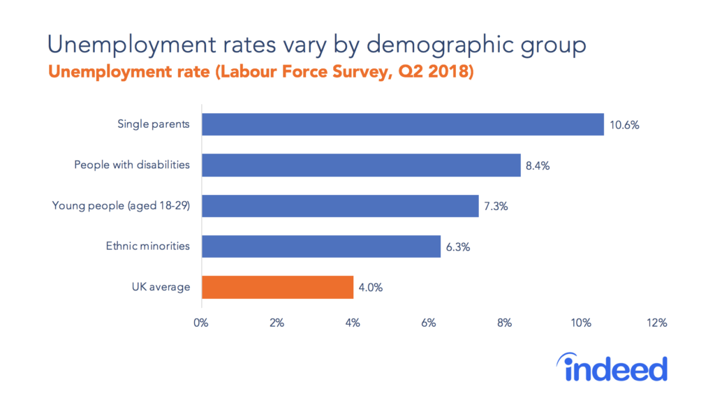 Hiring challenges. Low unemployment, falling migration and uncertainty about post-Brexit migration policy mean that businesses in many sectors are finding it increasingly difficult to hire staff. To recruit the workers they need, will employers tap more into under-utilised demographic groups? Young people, single parents, minorities and people with disabilities are less likely than average to be part of the labour force and their unemployment rates are above average. Whether employers manage to attract those groups into employment through higher wages or benefits — or whether they respond to hiring difficulties in other ways, like investing in automation — is a trend to watch in 2019.