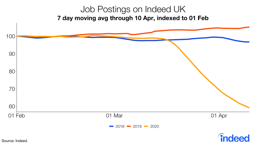 The job postings trend turned sharply downwards in mid-March as social distancing measures were ramped up. The downturn deepened further last week, with the volume of job postings down 44% versus a year ago as of 10th April.