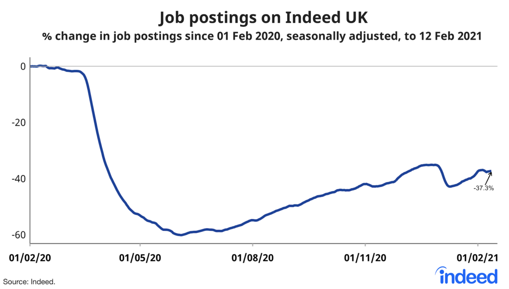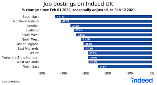 The gap in job postings versus the pre-pandemic baseline narrowed by 5.3 percentage points (ppts) between 12 January and 12 February, but remains substantial. With the Prime Minister due to announce the UK’s roadmap out of lockdown next week, many employers will be looking at the timescale for easing restrictions as they assess their hiring plans for the coming months.