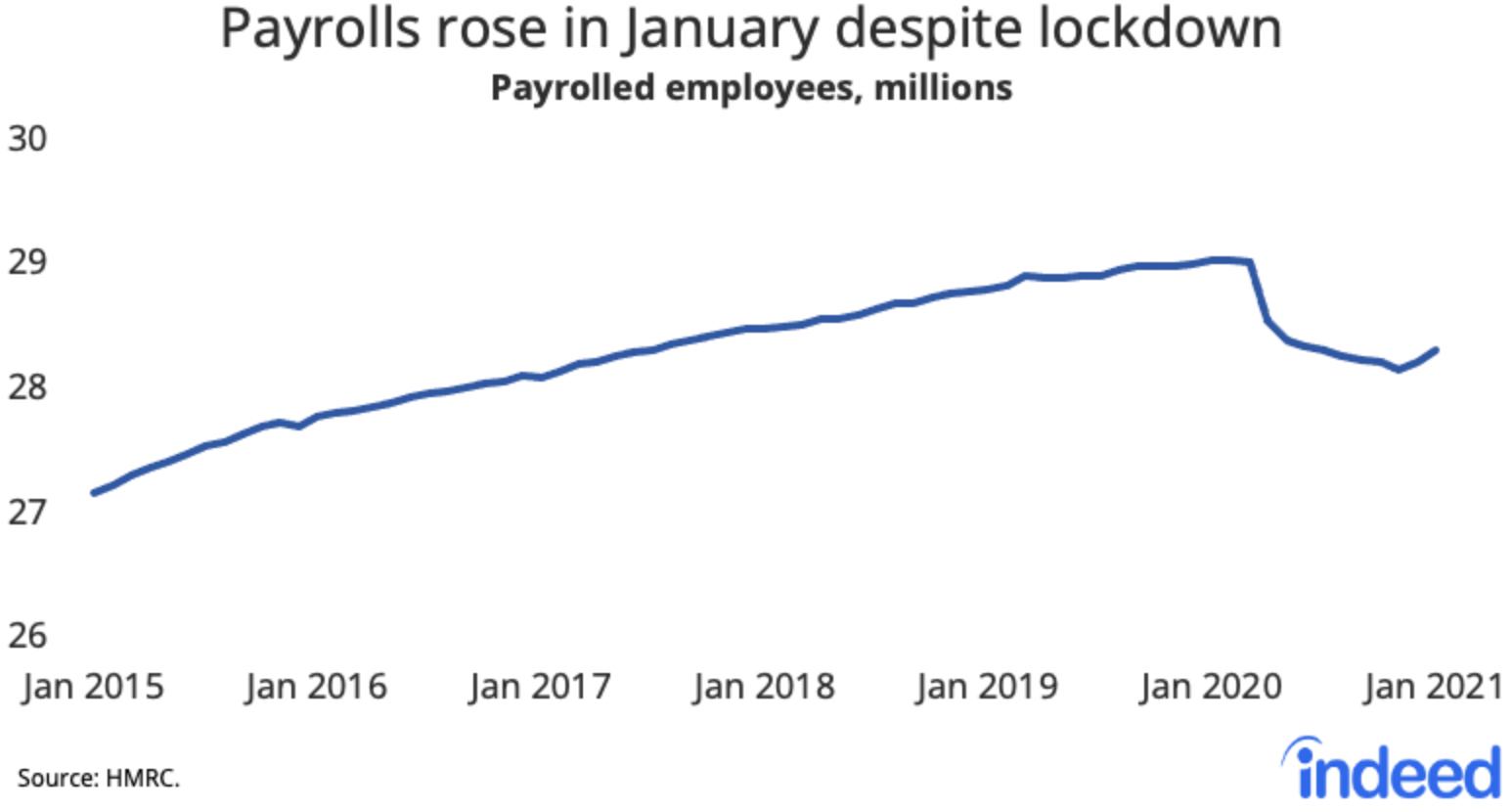 Latest ONS data provided further evidence that the labour market has adapted to lockdown. The number of employees on company payrolls increased by 83,000 in January despite the strict shutdown imposed at the start of the month. Business models have adapted to a new way of working, while the furlough scheme continues to support millions of jobs that can’t presently be done.
