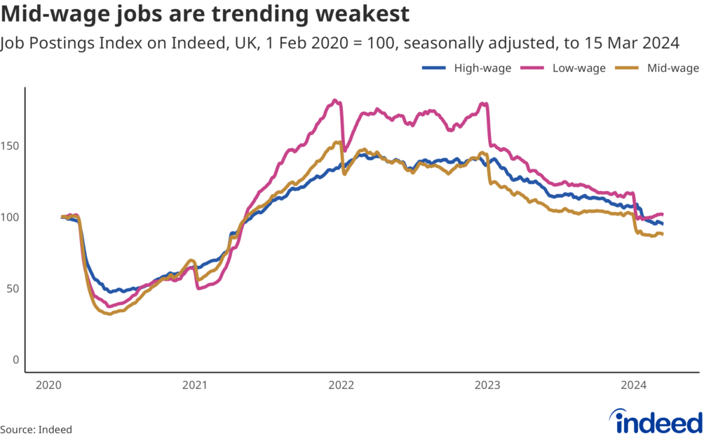 - Mid-wage job postings have seen the biggest decline from pre-pandemic levels.